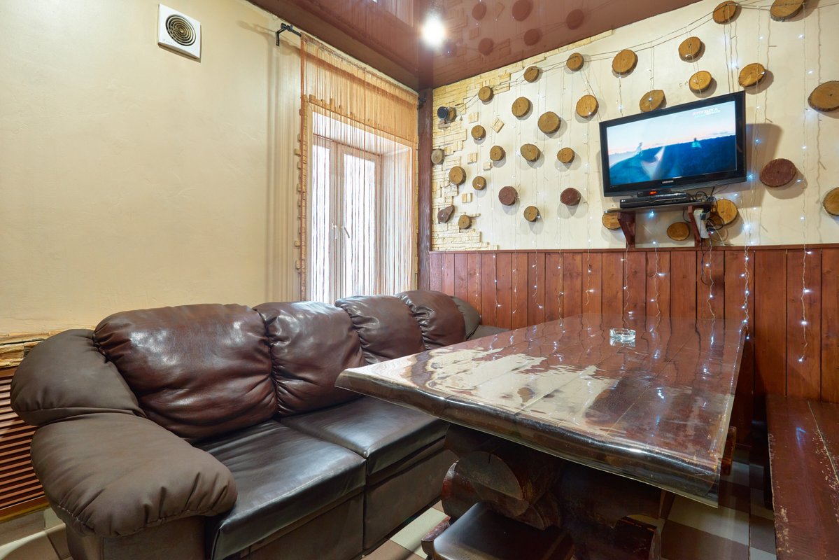 Большой стол, чистые диваны и мебель. Атмосферное место, реально, как в берлоге😉
